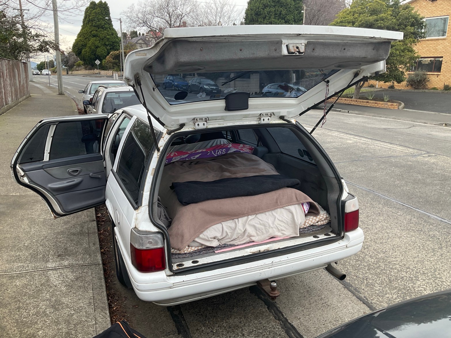 “For people staying on the street; rent is $10 for one night only; clean blankets and pillows; snacks and torch (see console); fried breakfast included; no smoking inside vehicle; quick early-rise required. Pay up front!”